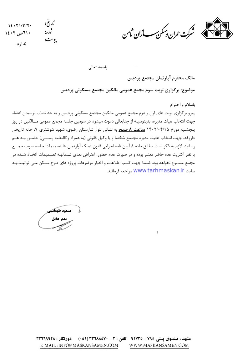 » دعوتنامه نوبت سوم مجمع عمومي مالكين مجتمع مسكوني پرديس